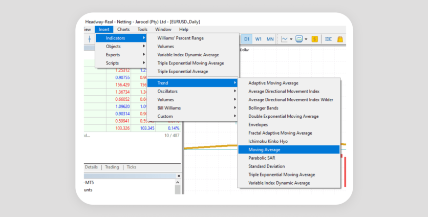To add the indicators in MetaTrader, open your terminal and click the Insert button in the upper left corner of the screen. Select Indicators, then Trend, and Moving Average.