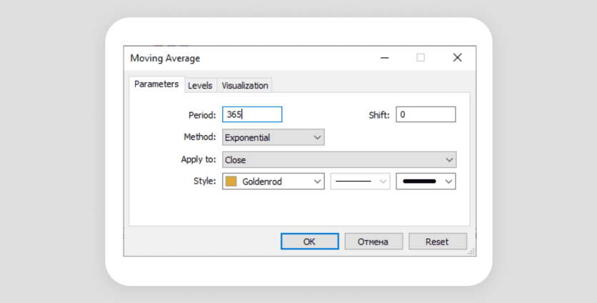 After opening the Parameters tab, change the settings of each indicator in the Period field. Lastly, change the color of each separate EMA to the one you like.
