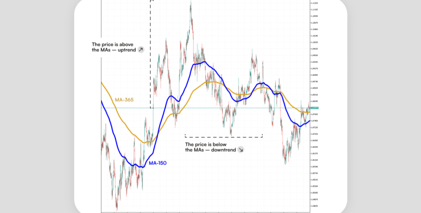When the price is above both the 365-period EMA and the 150-period EMA, the trend is bullish. When it is below them, the trend is bearish.
