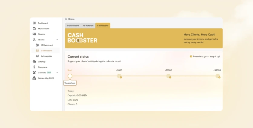 Finally, Cashbooster is now in the Personal Area. You can track your clients’ trading progress using our website! Learn more in our article.