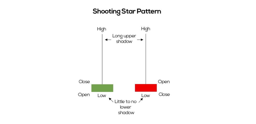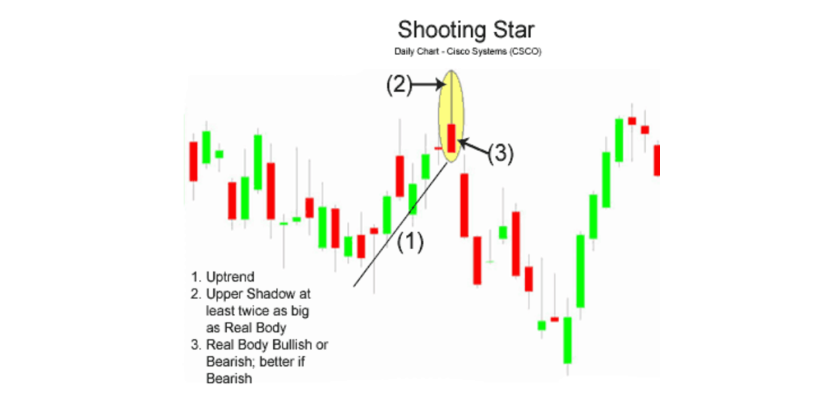The shooting star pattern is similar to the hammer model in terms of shape. The body of the candle is small, and it consists of one candle. Its upper shadow is at least twice the body of the candle, and it has a very small lower shadow. The longer the upper shadow is than the body of the candle, the better.