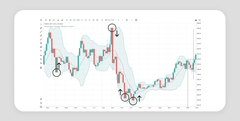- Find exit points. After entering the trade, you should think about exit points. It is best to use a Take-Profit order, so you can secure your profits and not worry about constantly monitoring the market. Place it near the support or resistance level. If you prefer to watch the markets, you can use Bollinger Bands: When the price moves towards the lower band or crosses it, gold is considered oversold, and vice versa. This way, you can plan your exit around the bands.