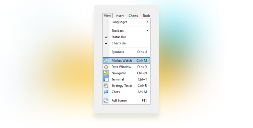 - View. Managing the terminal setup (language and windows) and the list of symbols (i.e., available trading instruments).