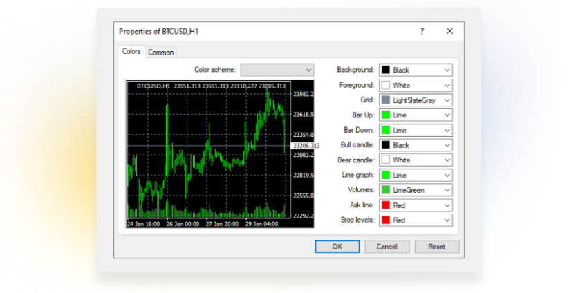 To manage the chart display, right-click a chart and choose Properties (or press F8). In the pop-up window, you can customize your chart type (bar chart, candlesticks, or line chart), its scale, colors, and required price specifications.