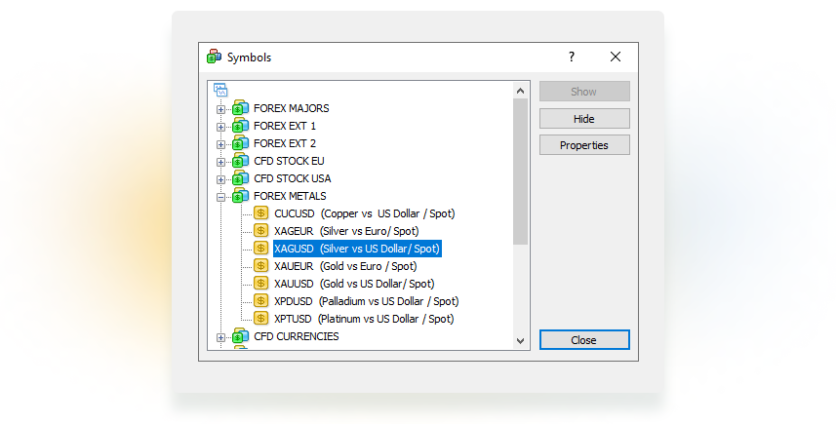 If you can’t find a specific instrument in the list, it may be that (1) you misspelled it, or (2) it is not available in this version of MetaTrader. Check the instrument specifications on the website.