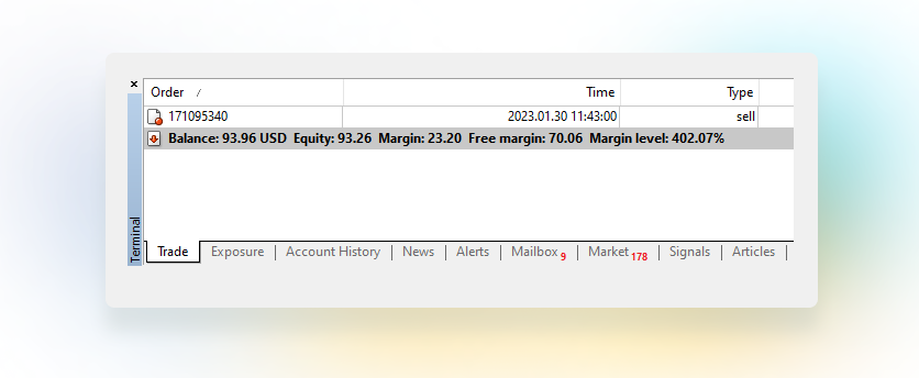 Terminal. Here are stored useful resources: your account history and notifications, platforms news, trading articles, and the like. The most important tab here is Trade where you manage your open positions.