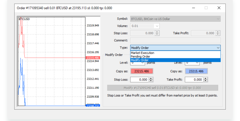 - Choose Modify or Delete (Type: Market Execution) in the dropdown menu.