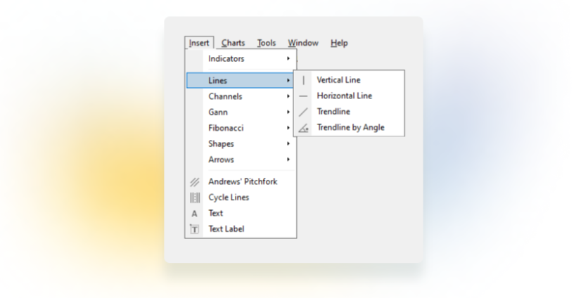 MetaTrader 4 offers over 30 indicators and 24 objects for technical analysis. Essential analytical tools are at hand in the Toolbar. You can check the full list of instruments in the Insert tab of the Main menu: Indicators, Lines, Channels, Gann, Fibonacci, and many more.