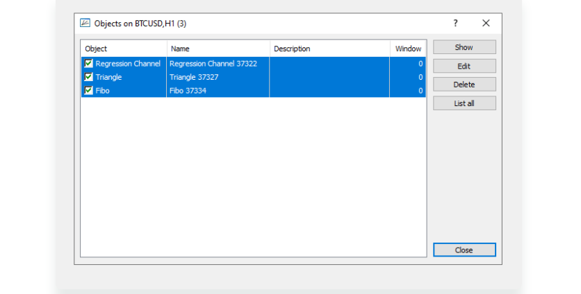 - Choose Objects List in the menu (or press Ctrl+B). A new window pops up. Here you see all objects you applied on the chart.