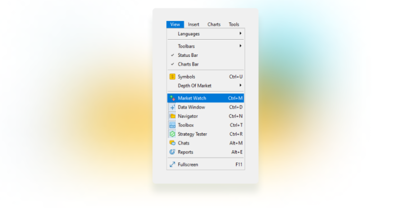 - View. Managing the terminal setup (language and windows) and the list of symbols (i.e., available trading instruments).