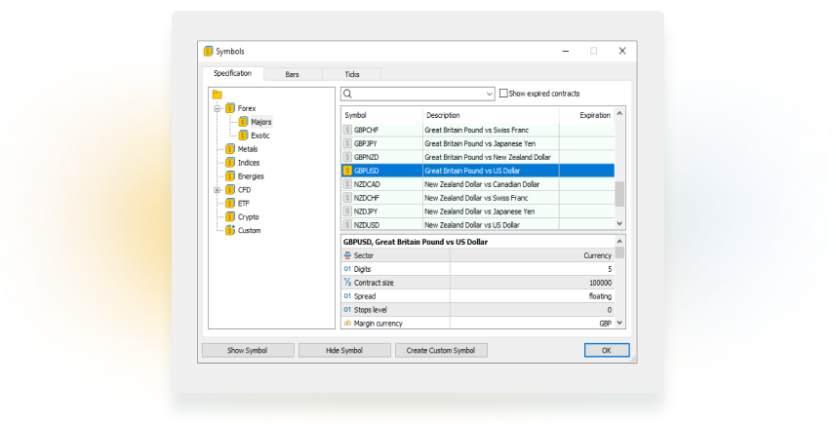If you can’t find a specific instrument in the list, it may be that (1) you misspelt it or (2) it is not available in this version of MetaTrader. Check the instrument specifications on the website.