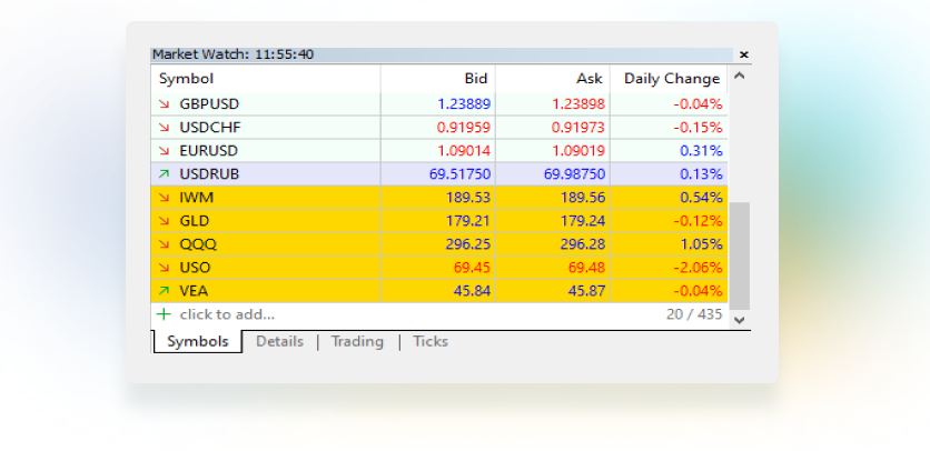 Market Watch. Use it to monitor your trading instruments: price data and movement, charts, specifications, and quick placement of positions.