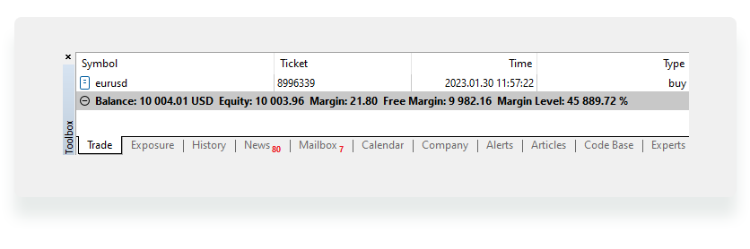 After you place the order, you find it in the window Toolbox, tab Trade (lower left corner). The terminal automatically calculates your profit based on the entry price and its current ever-changing level.