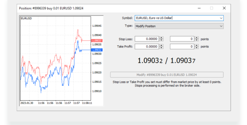 - Choose Modify Position (default) to place Stop Loss and Take Profit,