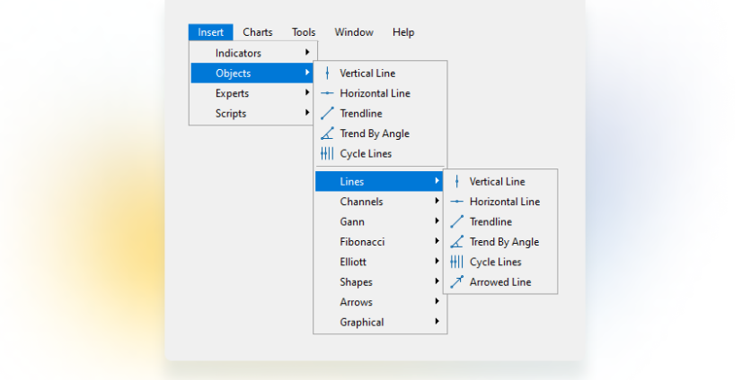 MetaTrader 5 offers 80+ technical indicators and elements for technical analysis. Essential analytical tools are at hand in the Toolbar. You can check the full list of instruments in the Insert tab of the Main menu: Indicators (e.g., Bollinger Bands), Objects (e.g., Elliot Waves, Fibonacci, Gann), Experts, and Scripts.