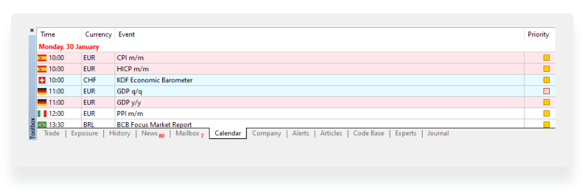 Pay attention to the priority of events. High (red square) and Medium (yellow square) priority events influence many markets. Take into account the upcoming reports and publications to plan your trading activity.