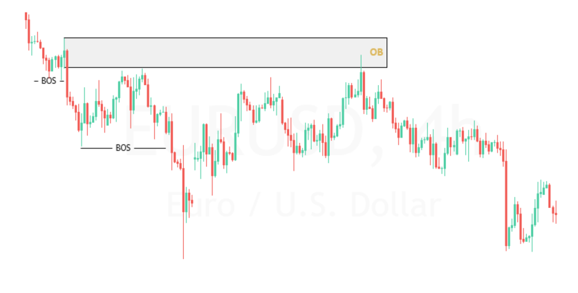 As you can see, the dominating trend is bearish, which means we should only look out for bearish OBs. A minor pullback on the left side of the chart occurs, but ultimately the trend resumes bearish, breaking the structure to the downside (BOS).