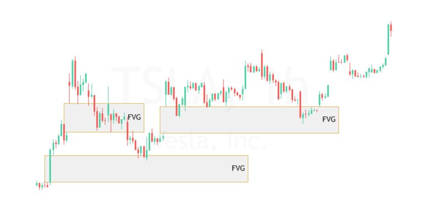 On the left side of the chart, we see a strong bullish candle. At the same time, the wicks of the candles it is between fail cover the body, leaving a wide void. This is your first FVG. Soon after, TSLA opens with a gap to the upside – the area of the gap between the previous and next wick is your second FVG.