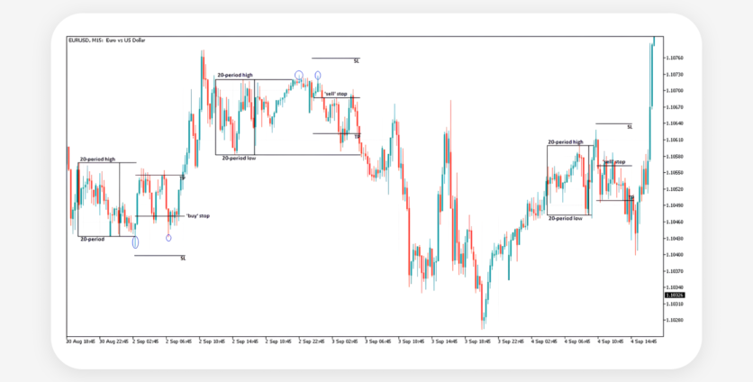 Depending on the timeframe you choose, the SL, TP, and stop order levels may vary in size. For example, for the daily chart, you should use a 50 pips range for your Stop-Loss. For the M15 chart – only 3/5 pips distances.
