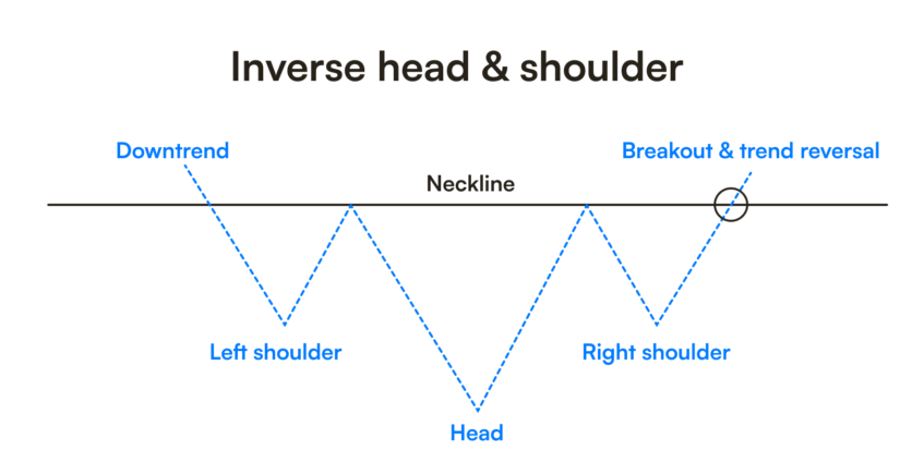 - Inverse Head and Shoulders is a bullish reversal pattern found at the bottom of a downtrend, with three lows, where the middle one is the lowest. A breakout above the neckline signals a trend reversal.