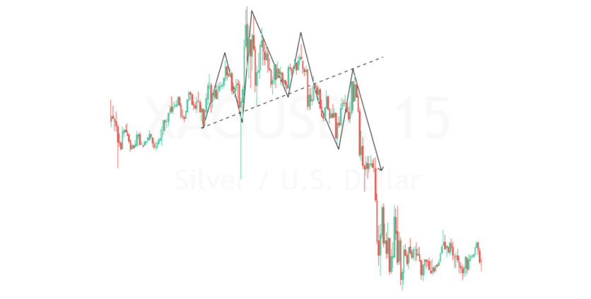 On the chart below, we can find a standard Head and Shoulders pattern, which formed on a silver (XAGUSD) 15M chart. As you can see, the schematics are not always followed exactly as drawn. In this example, the neckline is inclined upwards, and the right shoulder is higher than the left one. Also, a lot of volatility occurred, creating long wicks.