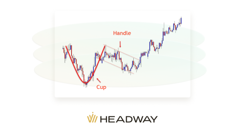 The cup part of the pattern is characterized by a "U" shape. It typically emerges following an uptrend. During this phase, the price tends to consolidate, forming the rounded bottom of the cup. Volume generally decreases as the cup is being formed.