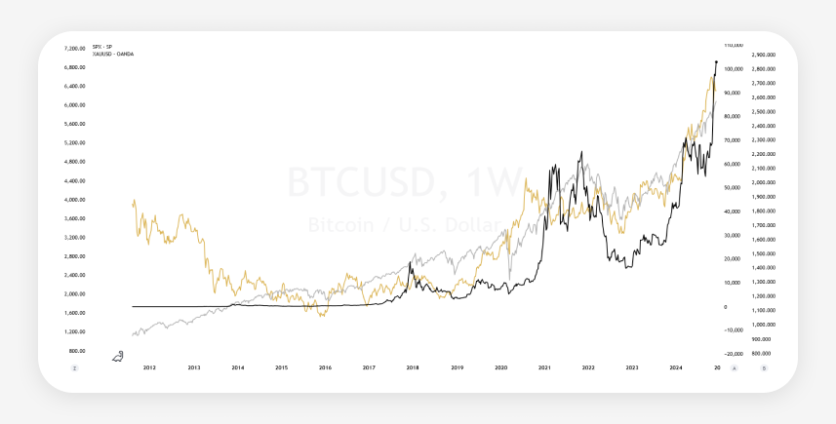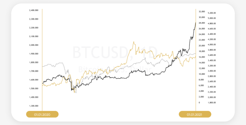 In the chart below, we can see a comparison of the dynamics of gold against the US Dollar (yellow), the S&P 500 (grey), and Bitcoin against the US Dollar (black). Visually, we can assess that in the last 12 years, BTCUSD has shown more correlation with the main US bourse index than with the precious metal, known to be a reliable, thousand years-proven hedge against inflation.