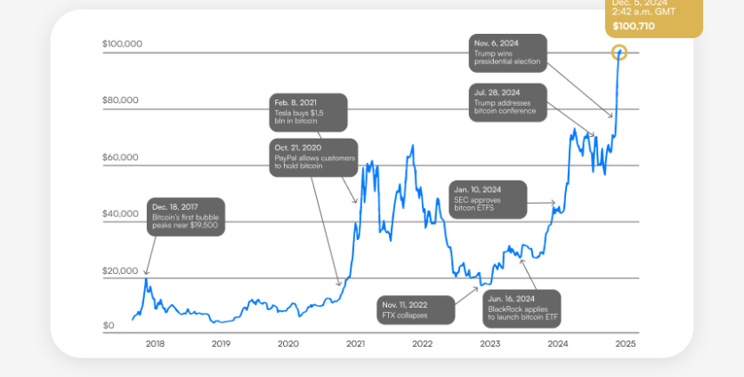 It was with the anticipated victory of the Republican, pro-crypto candidate, that Bitcoin saw a major price increase this year. In just one month – from November 6 to December 6 – BTCUSD saw a 50% increase in price, going past $100,000, as evermore positive news for the crypto industry continued to accumulate after Trump’s win.