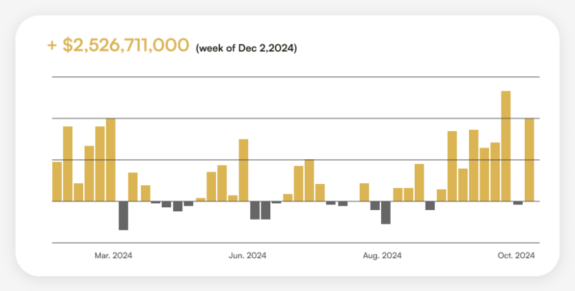 As of today, the total Assets Under Management (AUM) of spot BTC fund managers stands at $58 billion YTD as of December 06. (Meanwhile, gold ETFs AUM stand at $274 billion as of November 2024).