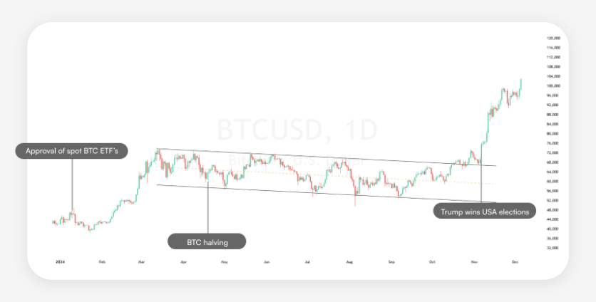 The second major driver in H1 2024 was the halving event, occurring once in four years. Over the past three halving events, BTC prices recorded spikes of 30,000% (2012), 786% (2016), and 720% (2020). This brought many market participants long, while BTCUSD traded in a wide consolidation pattern for almost 7 months straight. Historical dynamics proved right, but only due to the outcome of the US election.