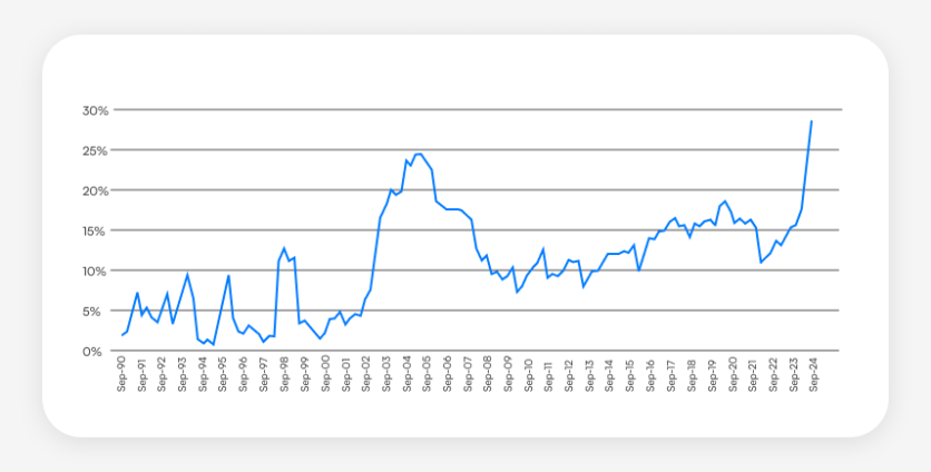 Since 2022, all three assets showed a similar dynamic, but each was driven by its own causes. All of them fell in 2022, as the Fed hiked interest rates, but they started rising again in 2023. The S&P rose on the new “Magnificent Seven” dynamics, riding the wave of exuberance about AI, while the other 72% of the index underperformed its annual gains. Gold edged up due to geopolitical unrest, the ignition of conflicts, and broader global recession fears.