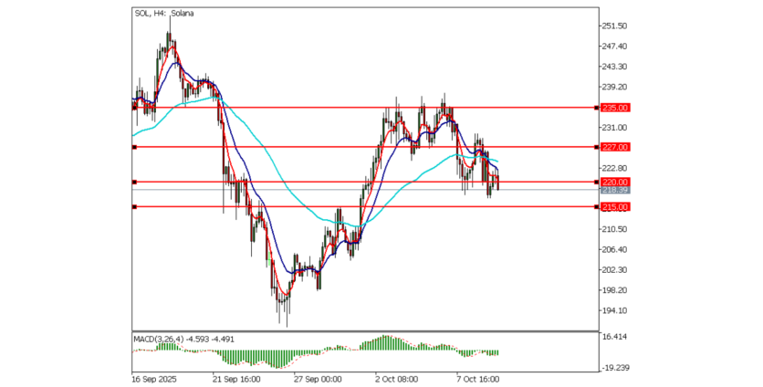 SOL continues to show higher volatility. It's finding support around $215-$220 but needs to clear the $227-$235 zone to see significant upward momentum.