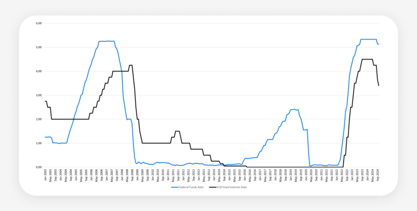 Between 2003 and 2024, the US and EU central banks followed strikingly similar trajectories in their interest rate policies due to shared global economic trends. In the early 2000s, rates were kept low to encourage growth but were subsequently raised as economies started overheating right until the 2008 financial crisis. This financial catastrophe prompted swift reductions in rates to near-zero levels where they remained for an extended period to foster economic recovery.