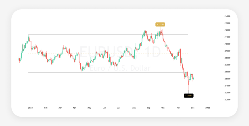 In 2024, EURUSD experienced relatively stable trading within a narrow range of 1.12000–1.06000, reflecting the complex interplay of monetary policies, broader economic trends, and geopolitical factors.