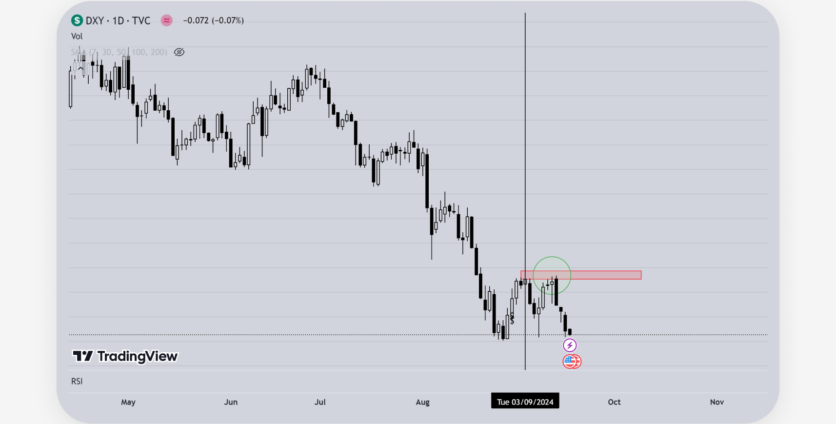 As we can see on the charts, a supply zone formed on the USDIDX chart on September 9, 2024. Before that, the index was in a clear downtrend. For that reason, we look for a trend continuation set-up.