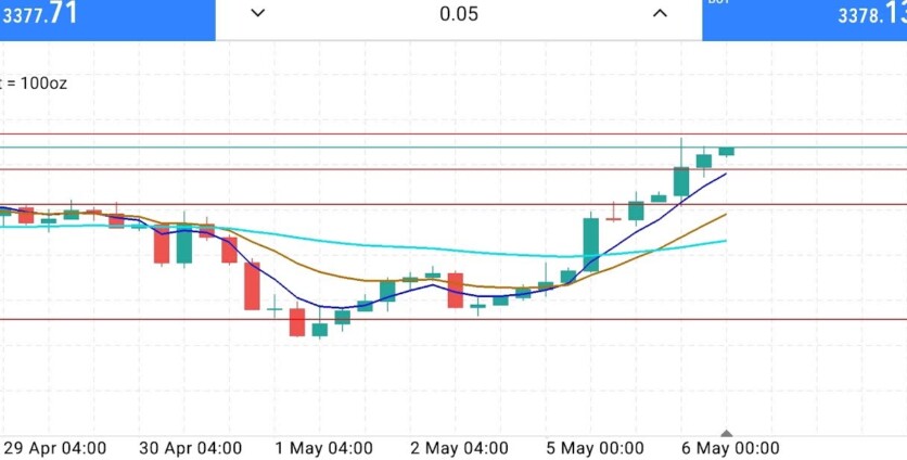 As of Tuesday, May 6, 2025, gold (XAU/USD) is trading around $3,368 per ounce, marking a two-week high. This surge is attributed to increased safe-haven demand driven by escalating trade tensions, notably U.S. President Trump's recent tariff announcements, and anticipations of a dovish stance from the Federal Reserve in its upcoming policy meeting.
