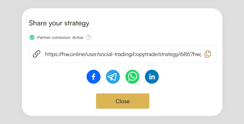 Another way to get more investors is by sharing your strategy link on other platforms. You can do this by clicking the share button in your Trader Area and copying the link to your strategy account. Even non-registered traders can still view your strategy stats and decide whether they want to follow you.