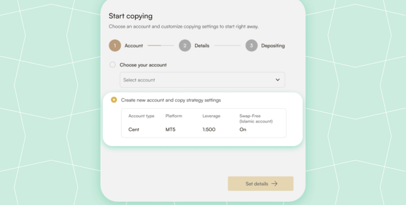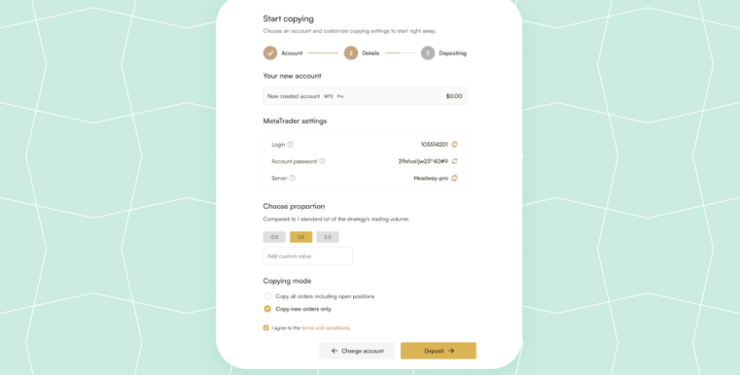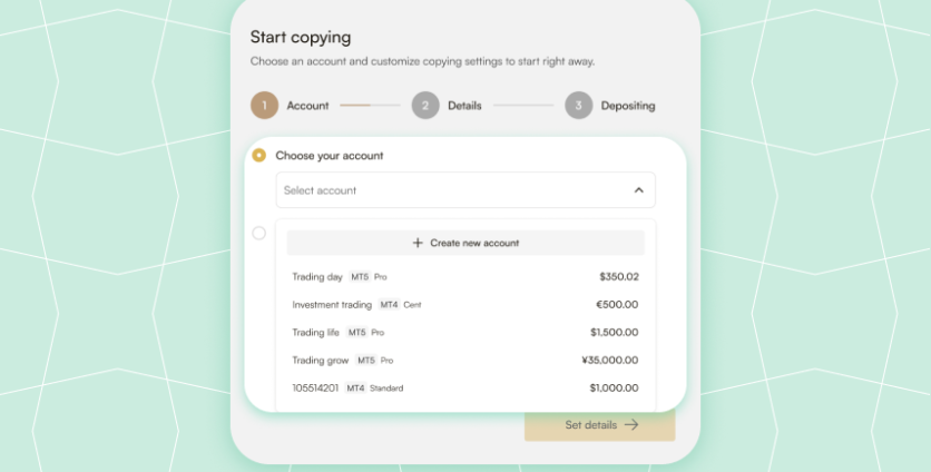 First, you will need to choose your copying account. A copying account is an account that is linked to the chosen strategy. Every copied trade is made there, so the account settings can impact your future profits.