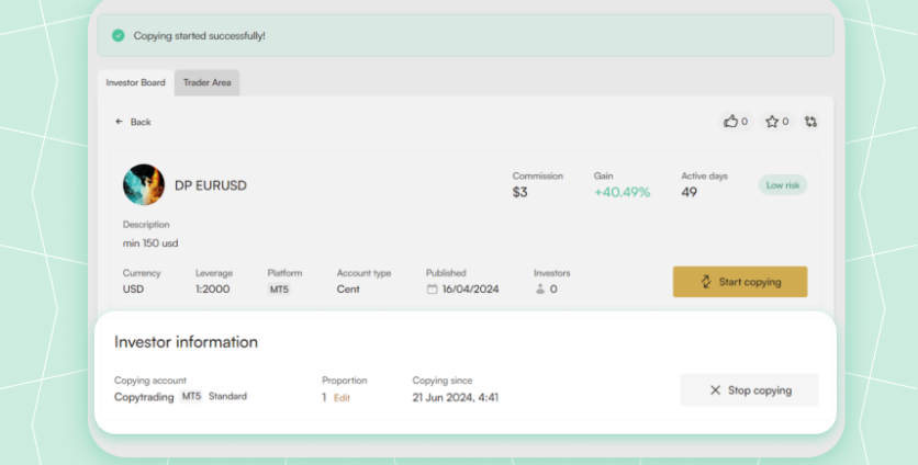 In order to begin your copytrading journey, click Start copying on the strategy details page.