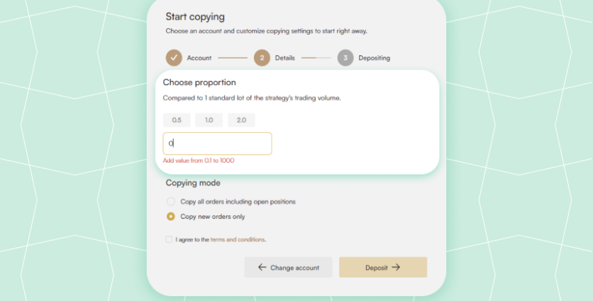 You can choose one of the preselected proportions or enter your own value from 0.1 to 1000. If you want to copy the strategy’s positions as is, choose the proportion of 1.0.
