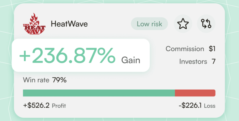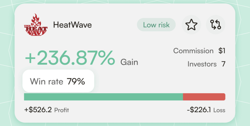 On the Investor Board, the win rate is shown on a strategy card above the green/red line. When you open a strategy page, you find it at the top of the page or above the performance charts.