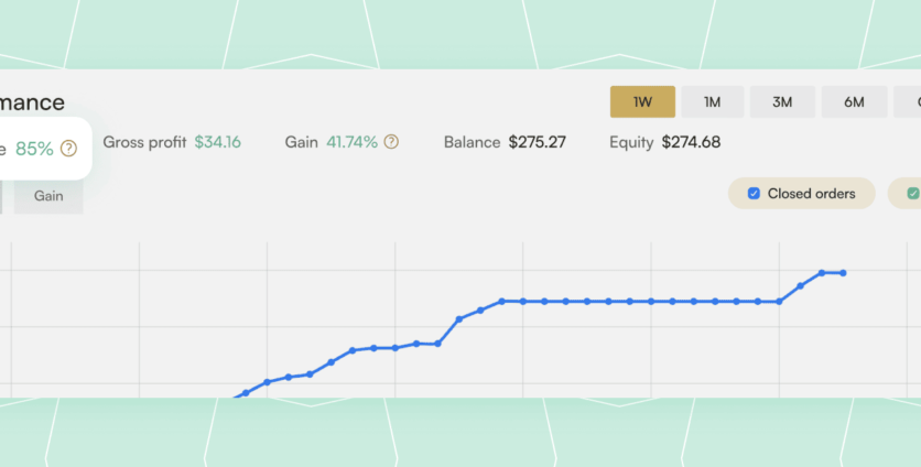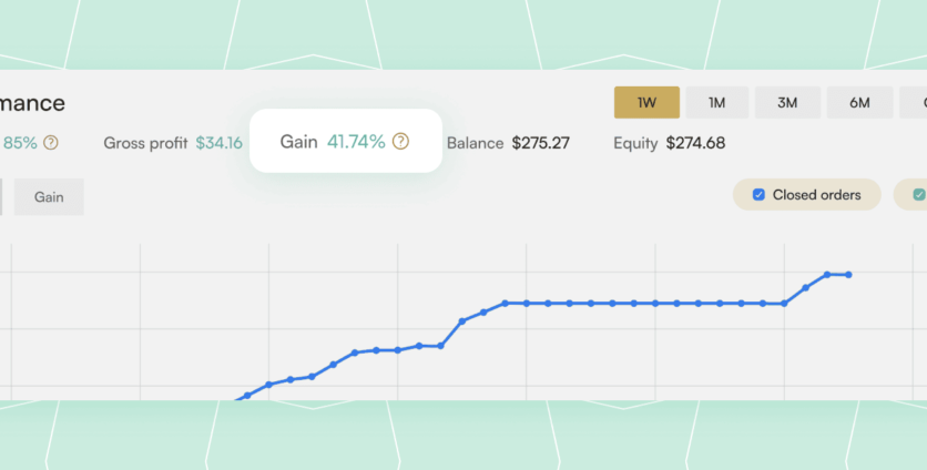 You may check the dynamics of the Gain change by switching the time frames on the right (1W, 1M, 3M, etc.) When a timeframe changes, you will see how the strategy performed over time – it is a valuable factor for your choice as well.